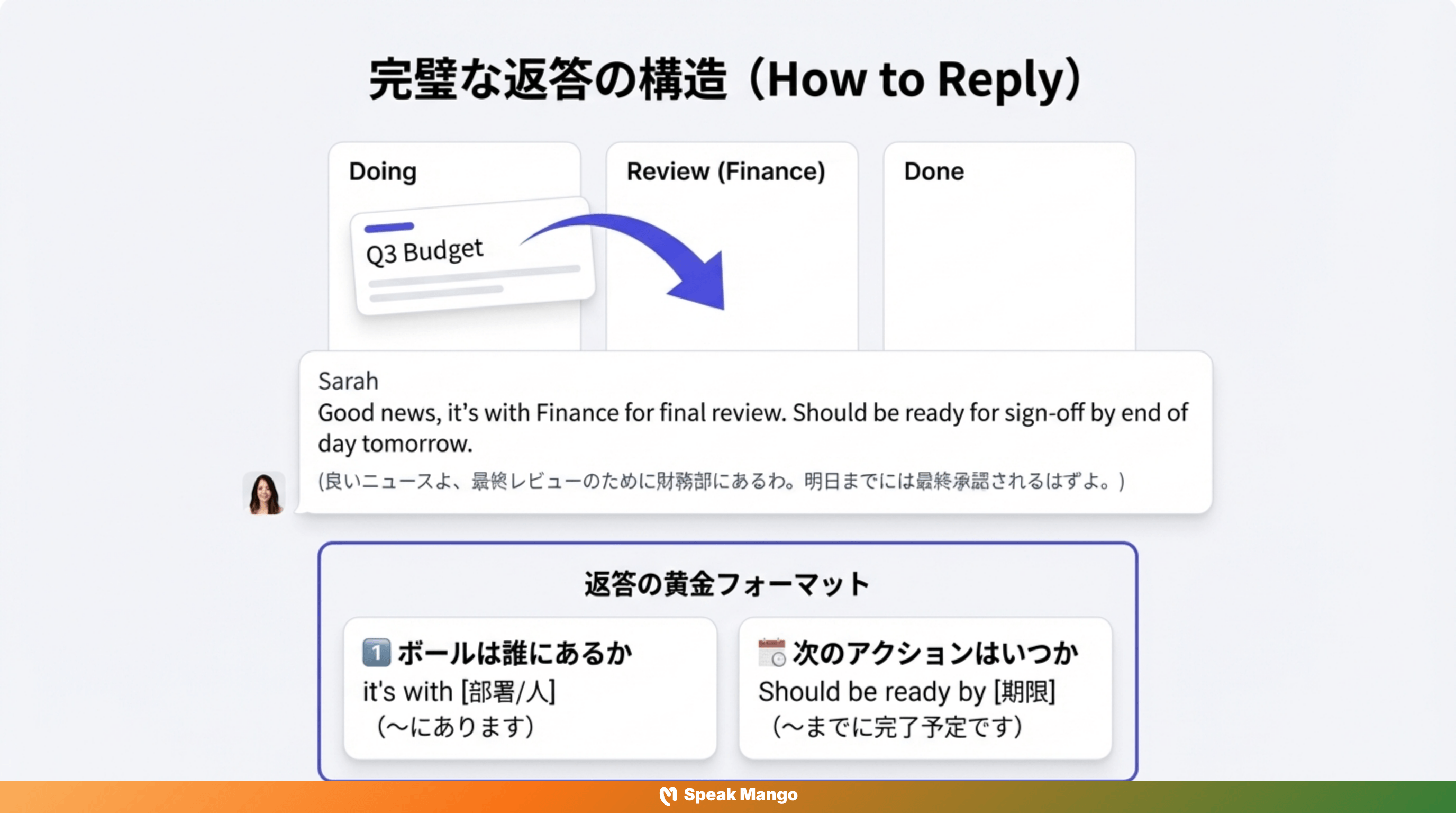 さらに、ネイティブスピーカーのような表現を使用したい場合は、「On」を追加することで、より明確な表現にすることができます。例えば、「What's the status on the Q3 budget report?」と聞くことで、特定のトピックについての進捗を聞くことができます。小さな変更ですが、大きな違いをもたらすことがあります 💡。